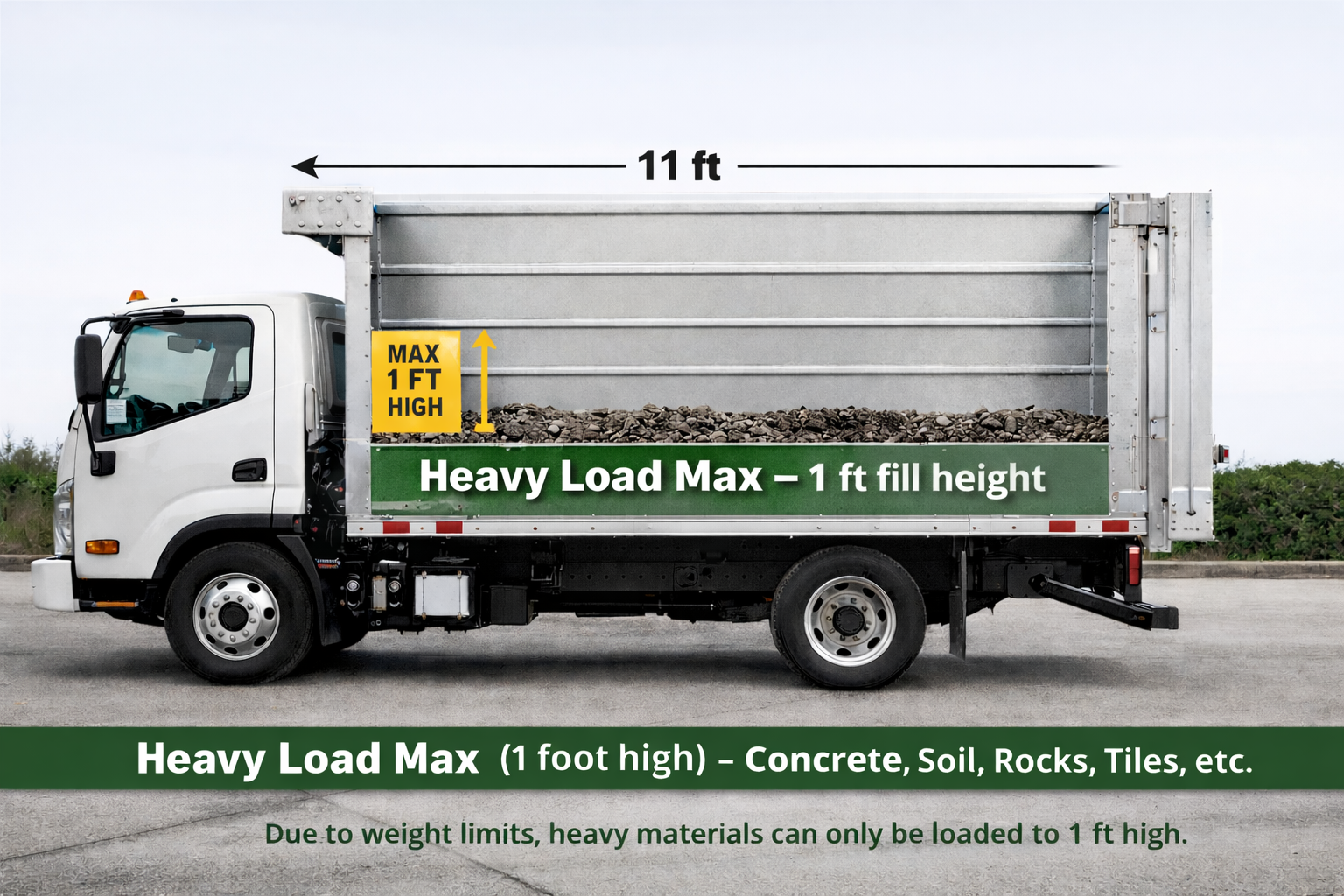 Heavier materials, including concrete, brick, rock, soil, tile, and other determined items, will be charged using our heavy load pricing. Due to the weight of the material, we can fill a maximum of 11’ x 5’ x 1’.